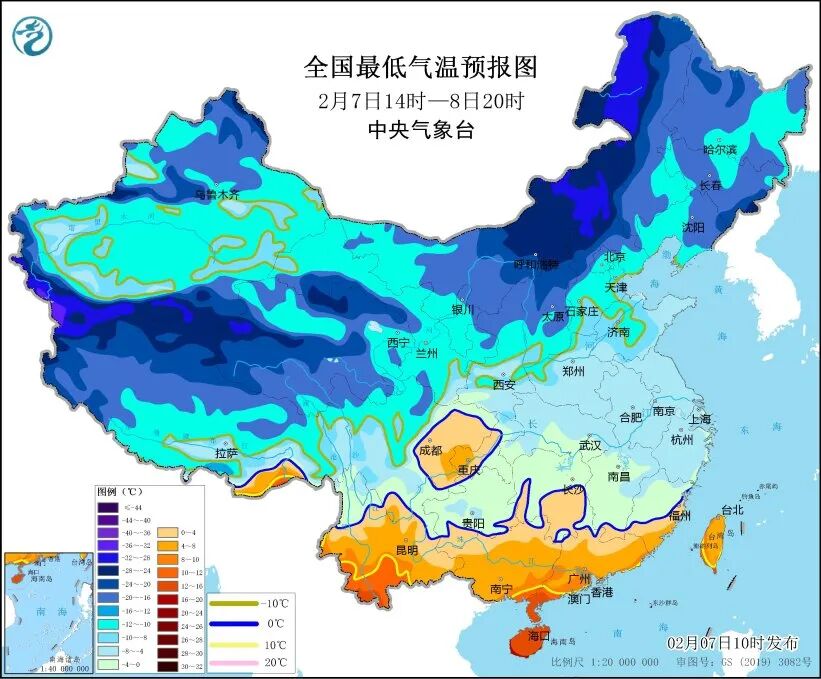 最低气温的低点则多在8日—9日早晨,最低气温0℃线将南压到贵州南部—南岭一带,长江以北地区最低气温普遍不足-5℃,黄河以北地区多在-10℃以下。
