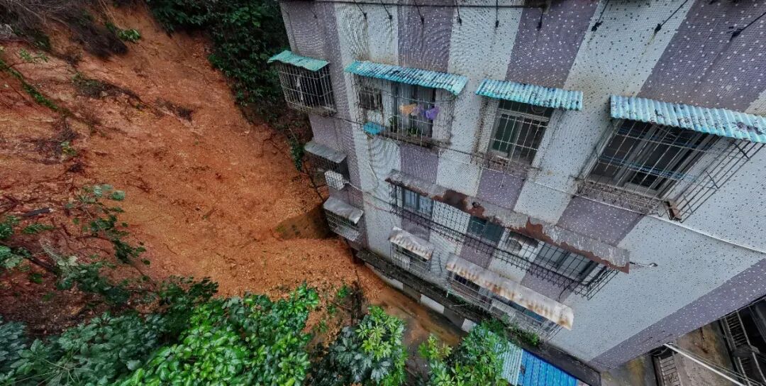 8月19日上午8时58分,41号居民楼四楼住户报警,称该处山体发生山体崩塌。市、县有关部门迅速到场核查,发现41号居民楼一楼、二楼房屋受损,三楼以上无房屋受损,未造成人员伤亡。因山体部分树木已没有支点,存在隐患,蓬江区于当日上午迅速将41号居民楼三楼以上31户83人全部实施转移安置。