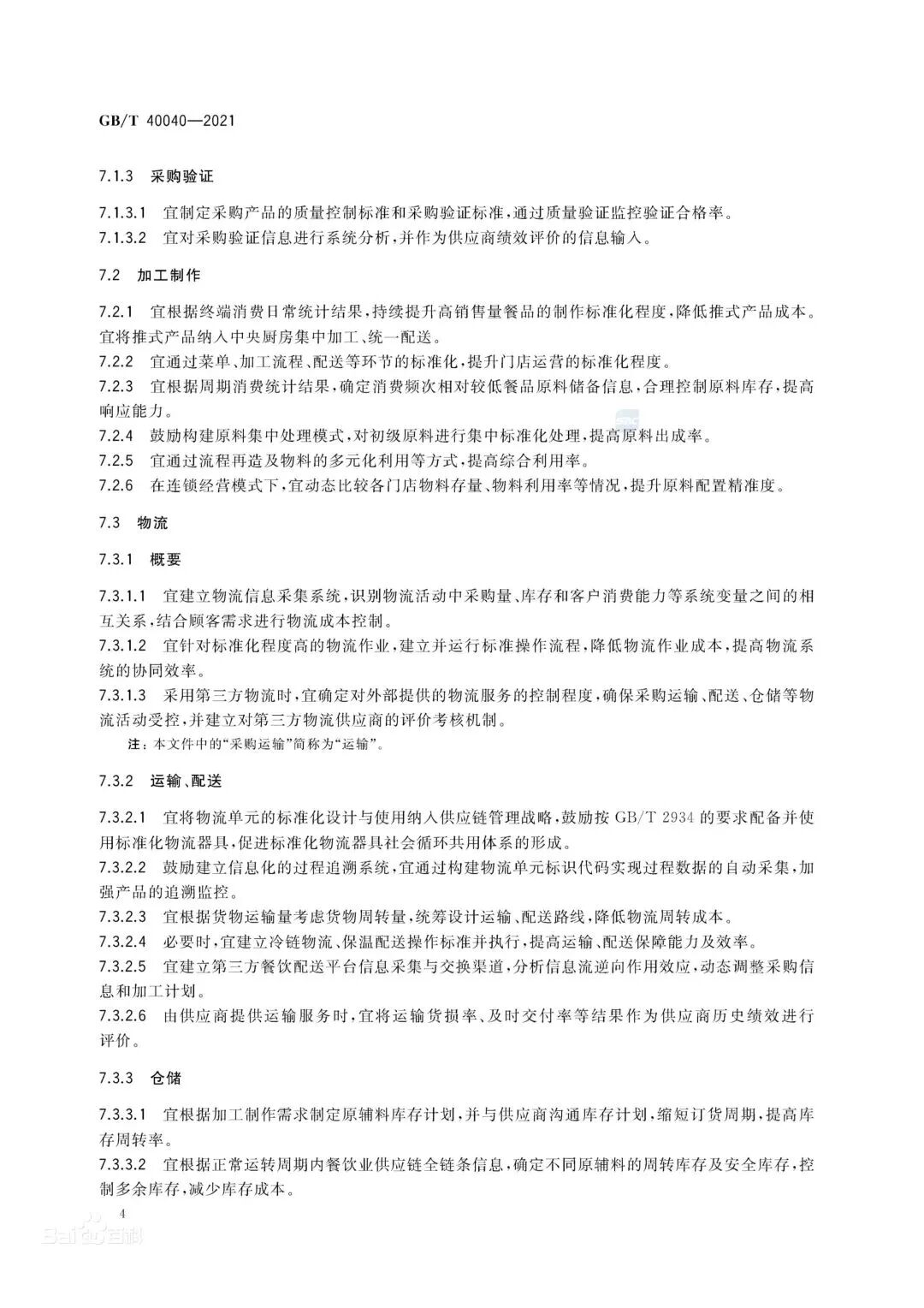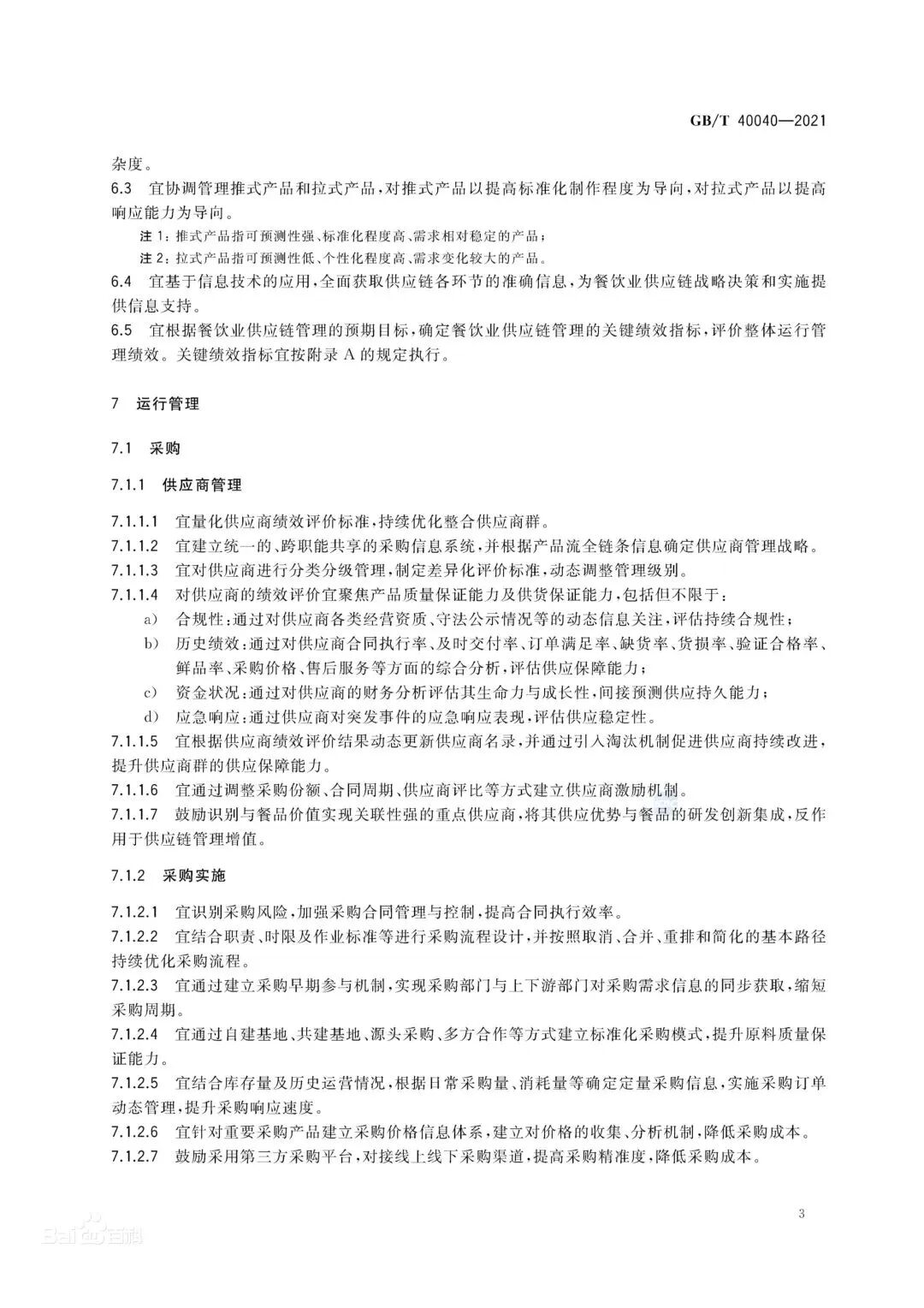 GB/T 40040-2021《餐饮业供应链管理指南》提供了餐饮业实施供应链管理的总则,给出了餐饮业供应链的基本模型、策划设计与运行管理的指导。该标准适用于指导餐饮经营企业实施供应链管理,其他相关企业可参照使用。