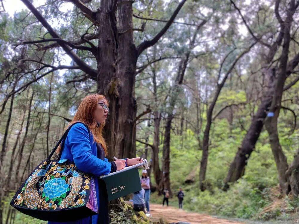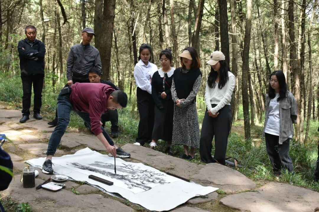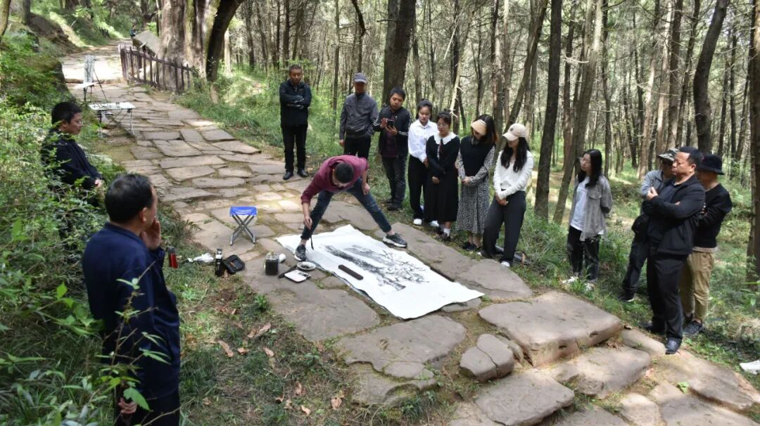 十余名学生聚集在古蜀道上写生
