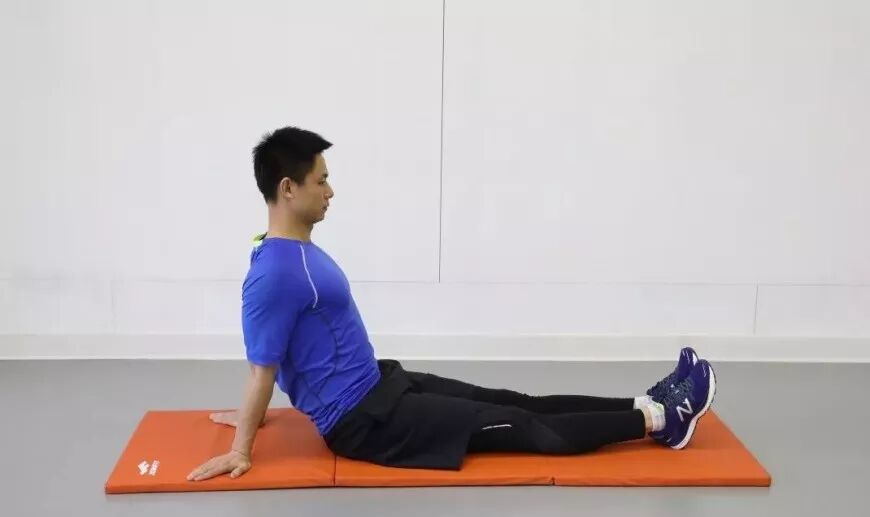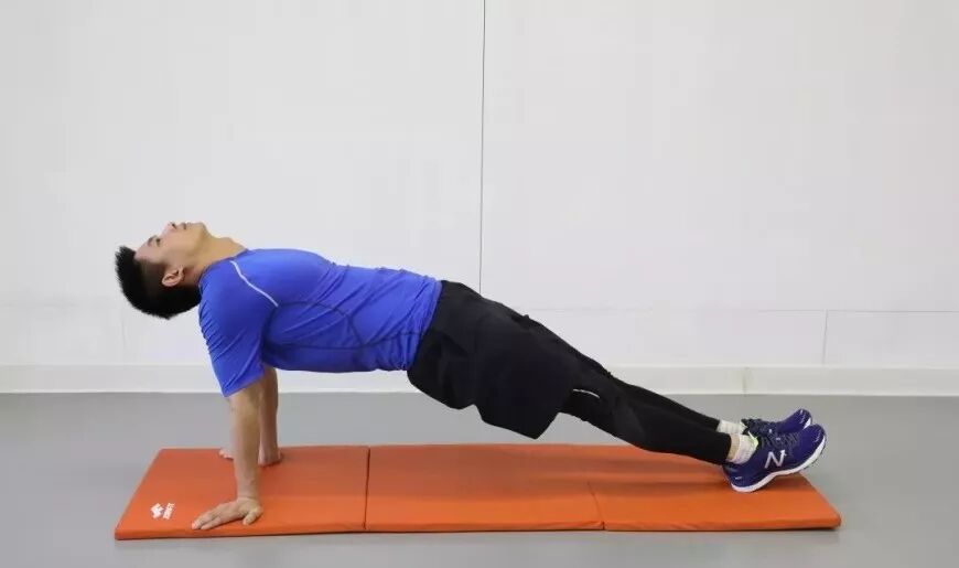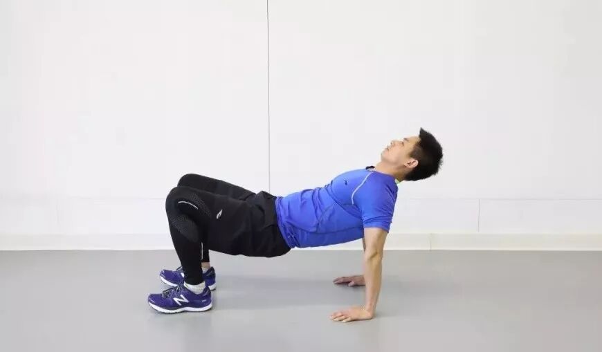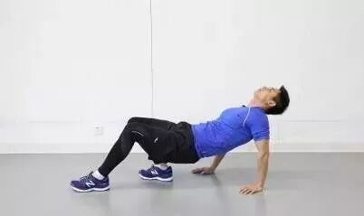坐于垫上,双手和脚后跟四点支撑,双腿伸直,发力将臀部顶起,保持身体成直线斜坡状态。此练习初期为减小难度可将腿部动作变为屈膝并且全脚掌着地,也可拓展为撑起身体(直腿或屈腿均可)后交替向上抬起左右腿,注意发力抬腿时尽量控制好重心不要有太大起伏,动作熟练后可保持屈膝支撑状态并向前行进。