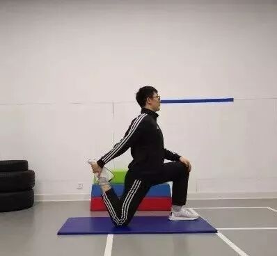 站立姿势准备,右腿向前跨一大步成弓步姿势,左膝弯曲着地成跪姿,左小腿向上抬起,左手拉左脚向躯干方向发力,至左侧大腿拉伸感明显时保持姿势,左右腿交替进行。