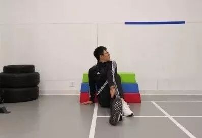 双腿伸直,垂直坐立,将右腿放在左膝的左侧,左肘置于右膝外侧,右手撑地于臀后,左肘发力推动右膝向左,同时尽力向右转肩转头,至下背部拉伸感明显时保持姿势,左右腿交替进行。