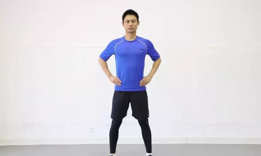 自然站立,双手身体两侧自然下垂,分腿跳同时双手头上击掌,双腿跳回并拢同时双手还原,控制节奏,注意手脚配合。此练习可拓展为蹲跳练习,即在分腿跳之前加一次深蹲动作,站起之后再进行开合跳练习,增加训练难度并进一步提高心肺功能。