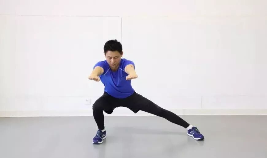准备时两脚与肩同宽站立,右脚向右侧迈一大步,屈膝降重心下蹲至右腿与地面基本平行,重心向右腿一侧偏移,躯干微微前倾,左腿伸直成弓步状态,右腿发力蹬直,重心移回两脚之间回到准备动作,左右腿交替进行。
