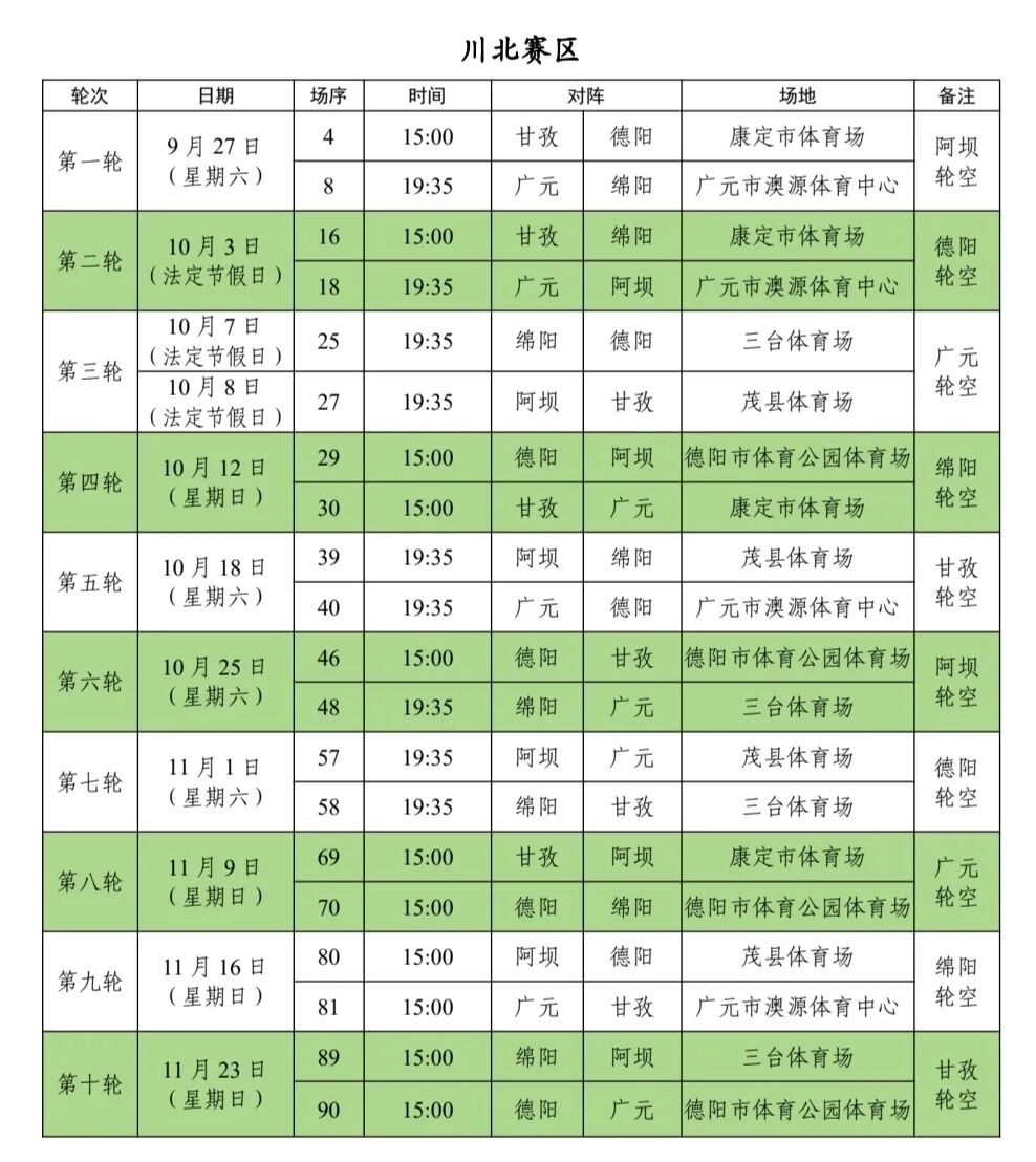 10月7日开始的第三轮比赛,广元队将轮空,球队得以充分休息调整。10月12日(周日),广元队将前往康定,在客场挑战甘孜队。川北赛区的所有比赛将在11月23日落幕,届时将产生本赛区出线球队。